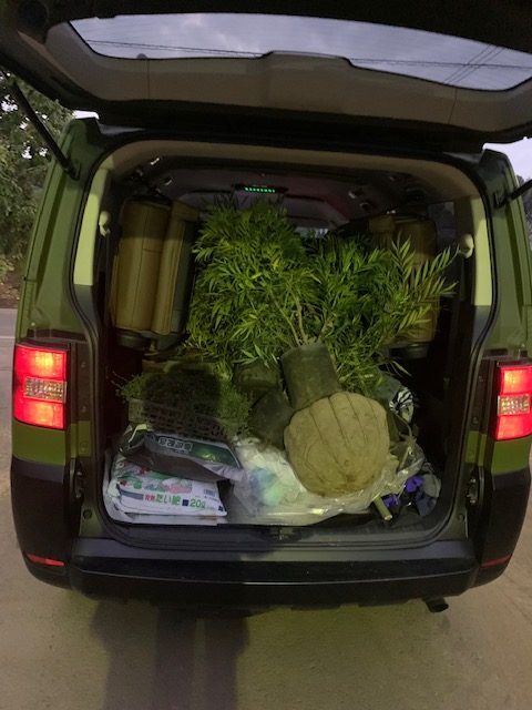 手順①:川口市安行の植木卸売業者さんへ今回使用するフェイジョア・ホソバヒイラギナンテン・タイムを取りに、行ってきました。
