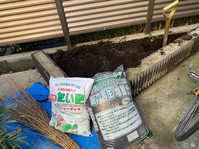 (土壌改良の為、たい肥と腐葉土を混ぜ込みます)